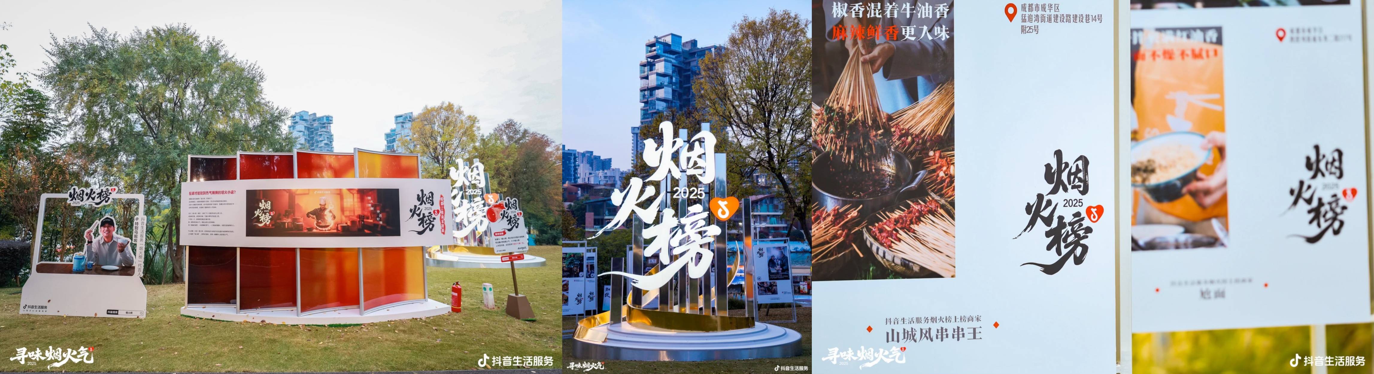 跟着「烟火榜」吃,帮你精准定位优质烟火好店,闭眼打卡不踩雷。无论你想找特色绝活好味还是家楼下的温馨小店,各种类型都能在这里找到答案。 上抖音搜索“烟火榜”,随时查看民间寻味人的真实测评,获取你所在城市的烟火美食指南。跟着「烟火榜」打卡,轻松吃遍地道人气好店,收获安心满足的烟火体验! 线上看榜,线下开吃!烟火市集等你打卡 线上看榜,线下开吃!在成都麓客岛,抖音生活服务举办了成都烟火美食市集,本次市集汇聚鸡排哥等近百家排队王美食,现场更特邀丁真、吴莫愁等600多位明星与头部达人亲临互动,和大家一起吃遍全国风味。
