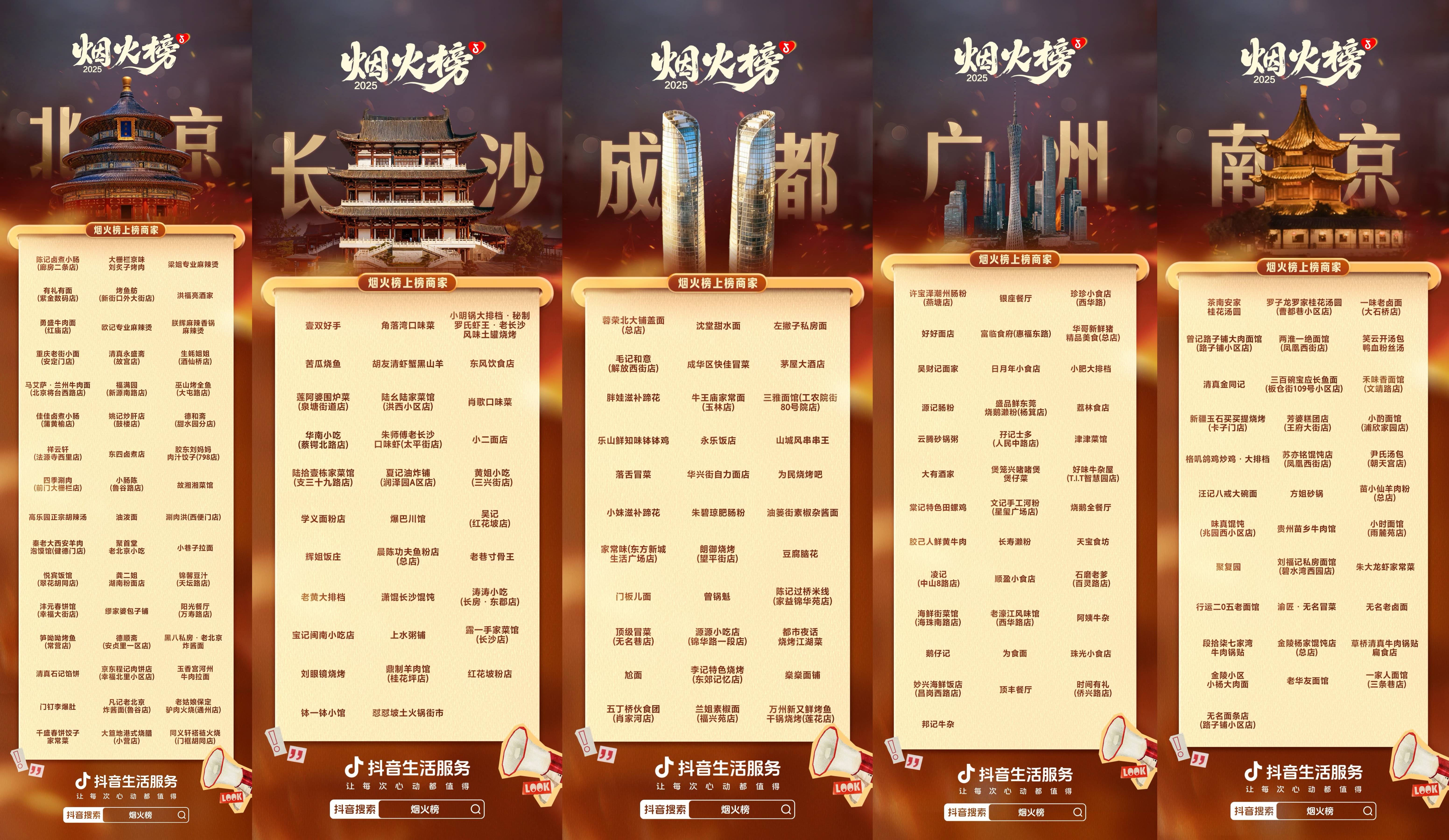聚焦明火现制,回归真实烟火气 在预制菜日益普遍的今天,我们越发怀念灶火升腾的锅气,那里藏着被时光打磨的手艺,也藏着最真实的人间烟火。 抖音生活服务「烟火榜」以“明火现制、绝活好味”为核心,依托平台真实数据和懂吃、会吃的民间寻味人的实地探访,用味蕾真实验证,寻出了那些坚持明火烹饪的匠心小店。每一家最终上榜的小店,都是一次值得专程前往的美味奔赴,都身怀自己的独门绝活——是全凭手感调配的独到风味,亦是几十年不改配方的坚守。 在这里,绝活不只是一个标签:它可能是一道匠心功夫菜,也可能是一段情的坚守,更可能是店主个人的执着。正是这些无法被标准化的部分,构成了小店独一无二的灵魂,让食物拥有了超越味道的温暖力量。 覆盖十城风味,轻松吃遍地道人气王 首期「烟火榜」基于站内民间寻味人实地吃出来的360家本地特色好店,由抖音生活服务「烟火榜的」代言人@特别乌啦啦 倾情推荐,覆盖北京、上海、长沙、成都、广州、南京、沈阳、武汉、西安、重庆十大城市,从街头小吃到地方菜肴,每一家上榜小店不仅拥有拿手绝活,更承载着城市的独特烟火气!